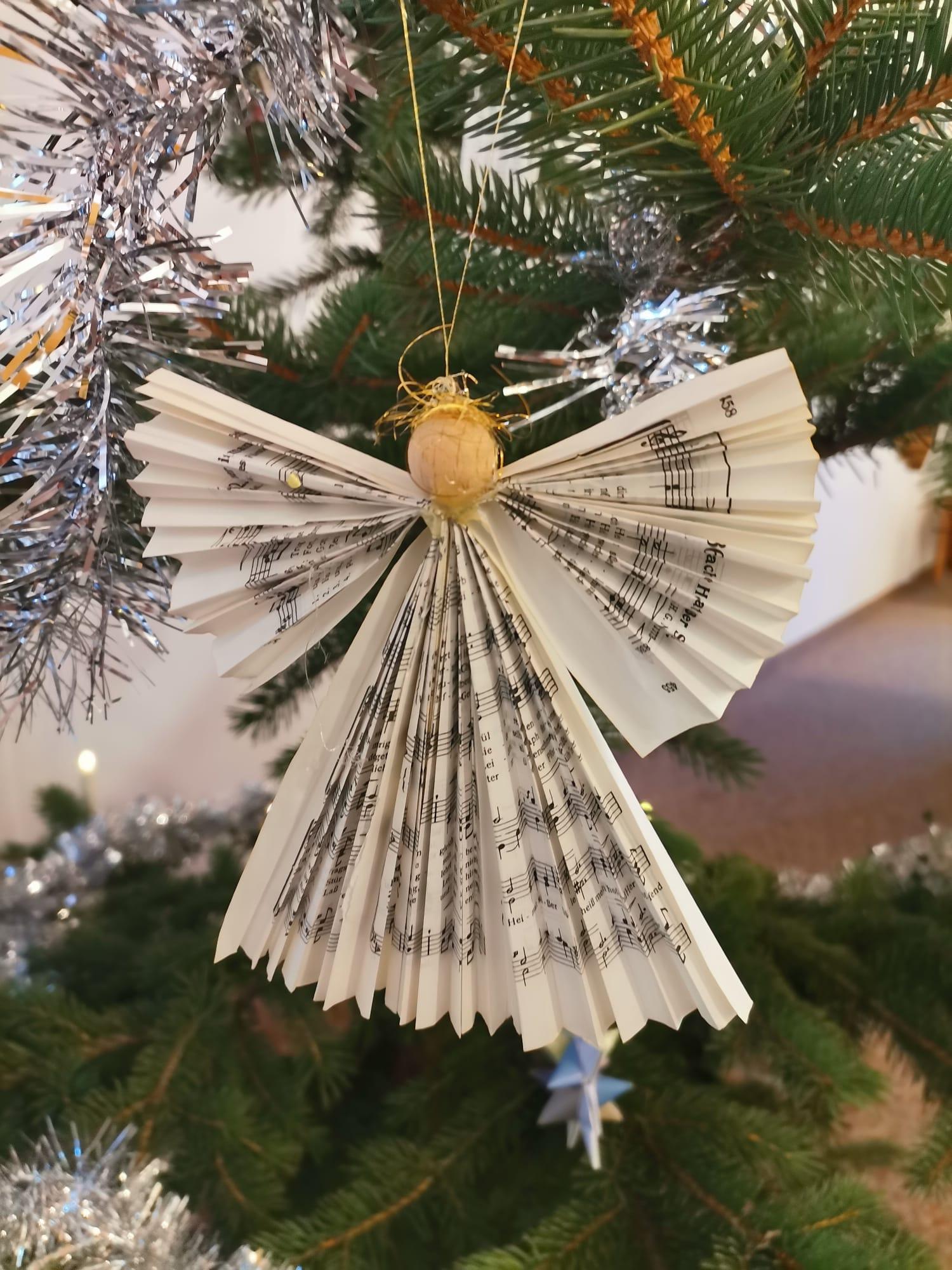 Nachdem Ylvi kleine Taschen aus Spitze dafür zusammengefaltet hat, konnte Cedric diese befüllen und mit Hilfe seines Opas Andreas auch an die obersten Äste hängen. Neben Tannenbaumkugeln und Schokolade fanden zahlreiche Fröbelsterne ihren Platz. Es war eine Freude und sehr interessant zu sehen, wie eifrig die Kinder dabei waren, ihre strahlenden Augen zu sehen und wie sie sich gegenseitig „beraten“ haben wo denn noch eine Kugel hinkann oder wo noch eine Schokolade fehlt - gern hätten sie davon noch mehr angehangen.