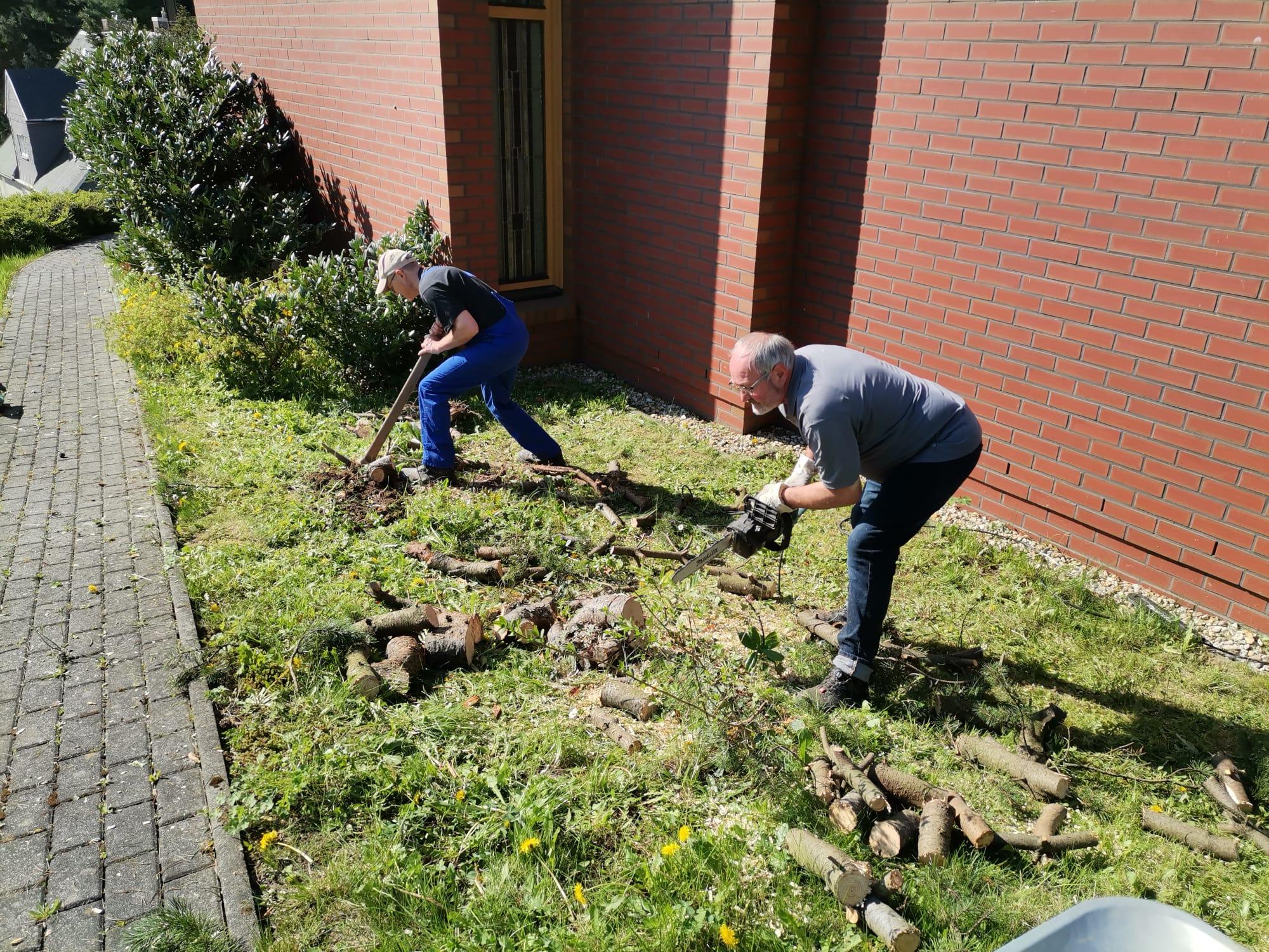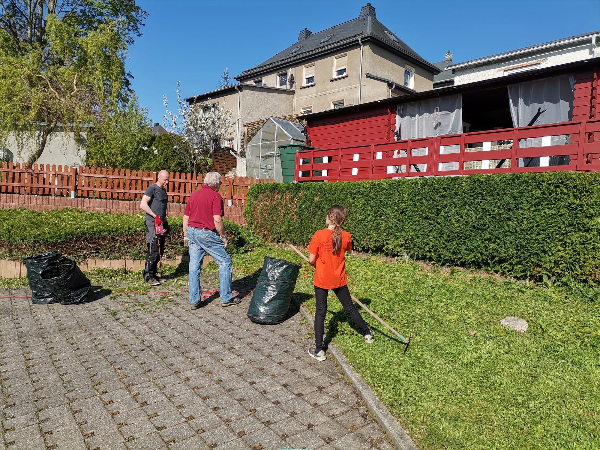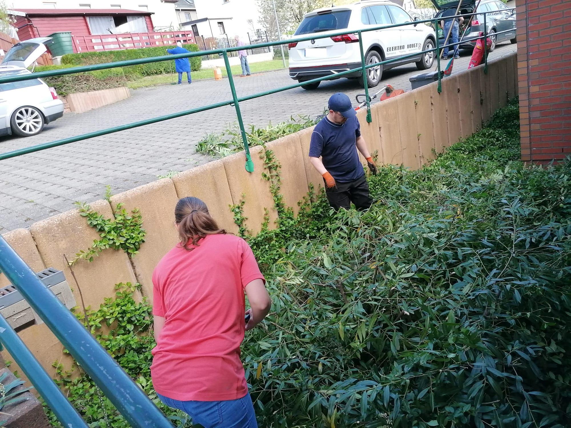 Im Außenbereich wurden Hecken verschnitten, Rasen gemäht, Unkraut gejätet sowie zwei Sträucher entfernt, um Platz für einen neuen Geräteschuppen zu schaffen. Dabei zeigte sich, dass einige Aufgaben nur im Team zu bewältigen waren. Das hat super funktioniert.